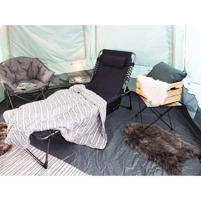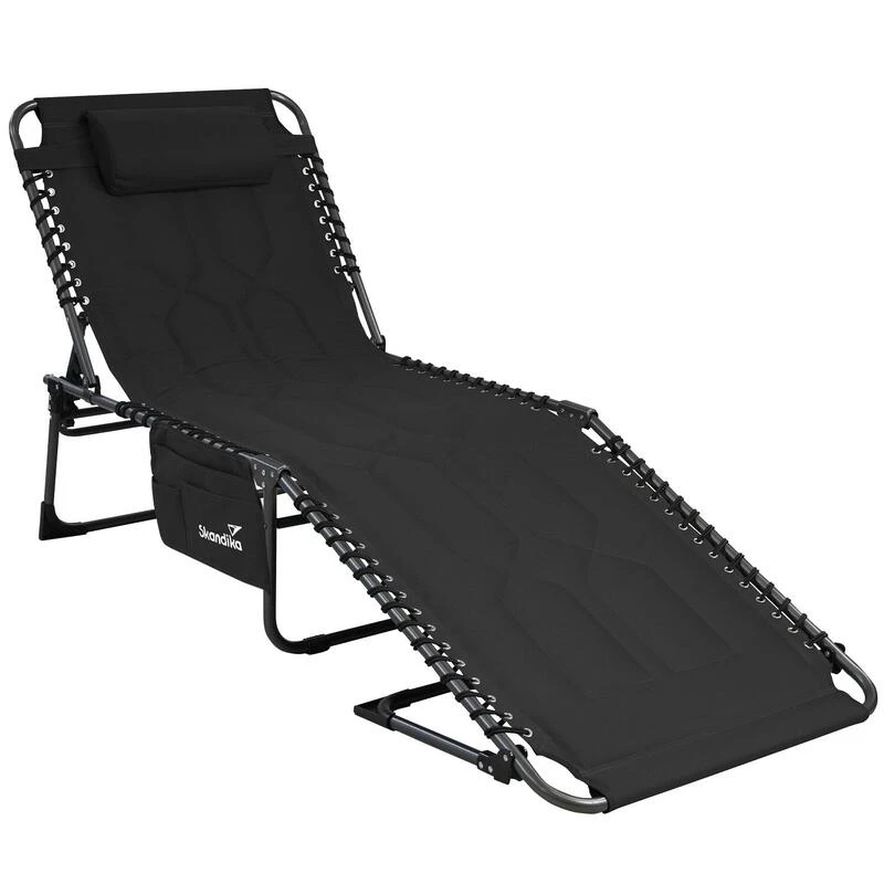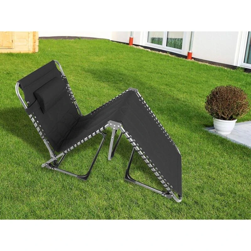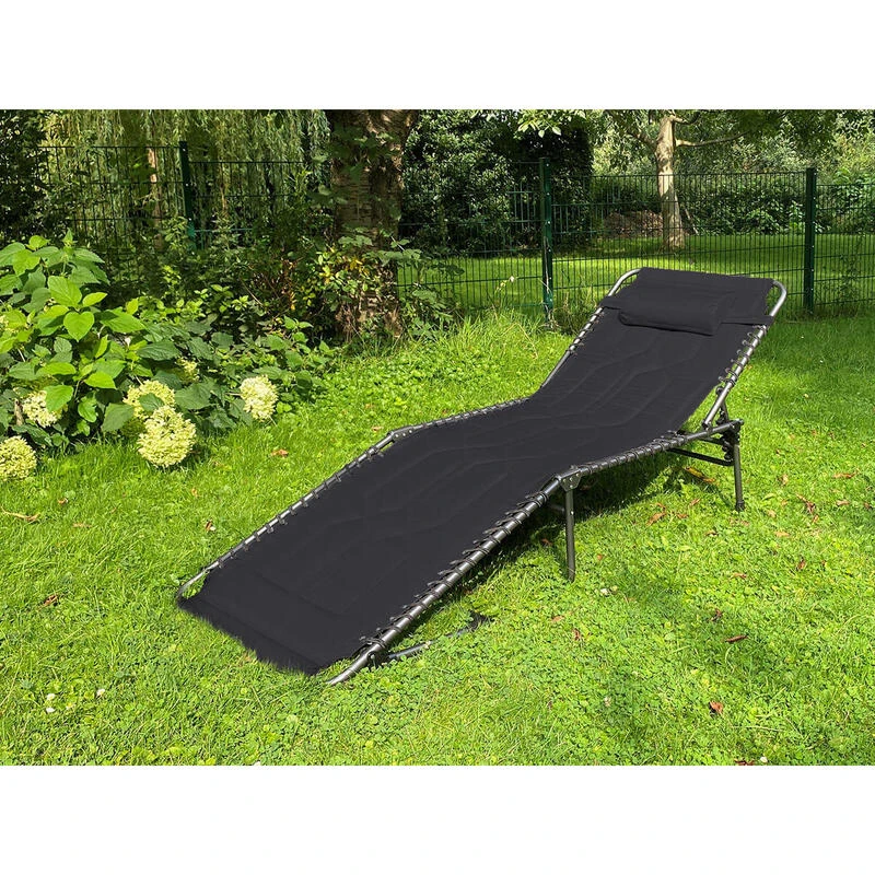 Chaise longue transat de camping pliable, rembourrĂ©e, rĂ©glable en 5 positions, appui-tĂȘte rĂ©glable, supporte max. 150 kg, hydrofuge, cadre en acier, coussin de tĂȘte amovible